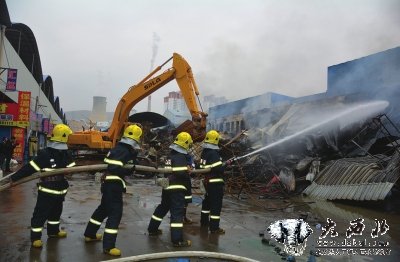 据了解,着火的17间商铺位于市场内五金区,主要经营的是油漆等制品。最早起火的是第三间销售保温材料的商铺,里面住着一对夫妻,发生火灾后,赶紧起床逃生,并报警。“衣服、钱,生活用品都没来及拿,火太大了,市场内的干粉灭火器根本不管用。”一位女商户告诉记者。当日上午8时许,火势基本被扑灭。为了能够将火势彻底扑灭,有关部门协调到一辆挖掘机,对已经“烧塌”的商铺进行破拆后消除复燃火患。