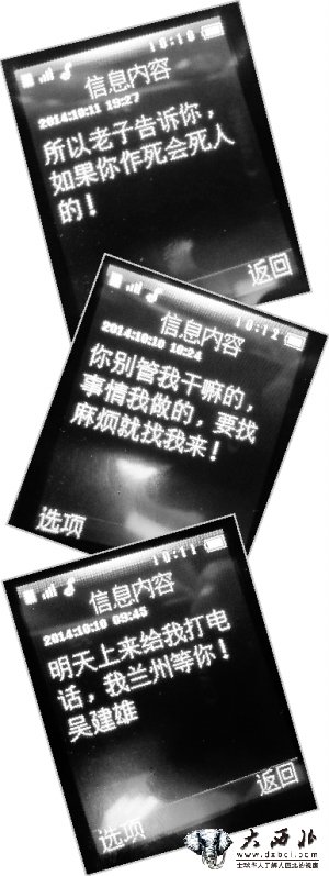 而让张平华感到不可思议的是,就在妻子的驾照分数恢复的同时,张平华不断收到吴建鹏发来的威胁短信,在短信中称:已经调查了张平华的家庭成员情况,要杀张平华的儿子等等。短信中还对张平华进行了辱骂。记者在张平华提供的手机短信中看到了其所叙述的内容,在辱骂和威胁之后,还署名“吴建雄”。