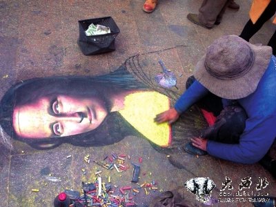 乞讨者的面前是一幅完成一半的蒙娜丽莎画像,头部已经基本完成,在外行看来已经画得惟妙惟肖,但是他还在不断重复用粉笔勾勒、用手指涂抹,然后用扇子扇除多余的粉笔灰,使得颜色出现渐变的效果,让画像看起来更加完美。这名流浪的男子虽然是用粉笔作画,只有红黄蓝绿白这几种简单的颜色可用,但是所绘画出来的图案看不出一丝粗糙感,相反十分细腻,让人感觉美丽的蒙娜丽莎就如同在相片上。虽然画还没有全部完成,但该乞讨者的画功已经令在场的围观市民赞叹不已。一位市民在现场说道:“真是高手在民间啊!”