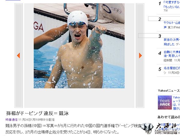 时事通信社以“中国自由泳的世界王者——孙杨违反兴奋剂”为标题的文章在日本雅虎被当作头条新闻,引来的网友评论已经超过两万条。报道指出孙杨在今年5月的全国游泳冠军赛中因药检呈阳性,遭到了三个月的禁赛处分。“孙杨在仁川亚运会中拿到了1500米、400米自由泳和4×100米接力赛三枚金牌。但中国官方没有说明在涉药事件发生了约半年后才公布消息的原因,而且也没有公开孙杨通过什么途径取得了仁川亚运的参赛资格”,认为中国方面很可能是为了仁川亚运而故意隐瞒涉药事件。报道还介绍了22岁的孙杨是中国游泳队的第一王牌选手,曾获得了2012年伦敦奥运会400米、1500米自由泳的冠军,2013年世锦赛一人独得了三枚金牌。同年发生了无证驾驶事件被国家队处罚,仁川亚运会也发生了“日本国歌门”事件……是一位不安分的,经常会发生争议性行为的明星选手。