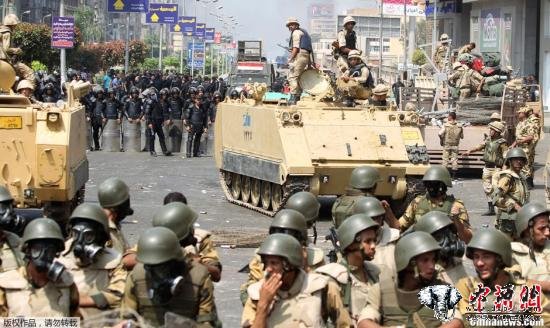 埃及安全部队2013年8月14日对首都开罗两处抗议者营地进行“清场”行动,终止前总统穆尔西支持者的静坐示威。清场行动开始后双方爆发激烈冲突造成严重伤亡。图为防爆警察和军方人员出动装甲车。