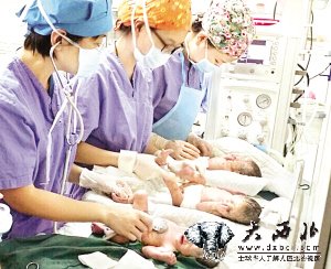产妇张某,32岁,来自武威市凉州区,汉族,在孕期检查时,B超提示怀有四胞胎。于今年5月开始在省妇幼保健院做产检。12月3日凌晨4时许,产妇出现临产征兆,产科专家经会诊,决定施行剖宫产手术。3日上午8时59分,四名男婴相继被取出,其中两个孩子体重1800克,最小的980克。