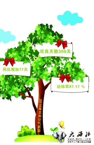 今年,面对10年来最大强度沙尘天气的影响,截至12月17日,兰州市空气质量老标优良天数306天,同比增加17天,达标率87.17%;新标达标天数246天,同比增加57天,达标率70.01%,成为兰州市有监测记录以来优良天数最多的一年。前11个月在全国74个新标发布城市中分别位于第24、40、48、62、63、46、51、57、52、24、49位,退出全国十大污染城市行列。据国家环保部统计显示,兰州成为全国重点监测城市中综合污染指数下降最快的城市,并呈现出优良天数逐年增多、人为因素导致的重污染天数逐年减少、污染浓度逐年降低、综合污染物指数逐年下降的良好趋势。