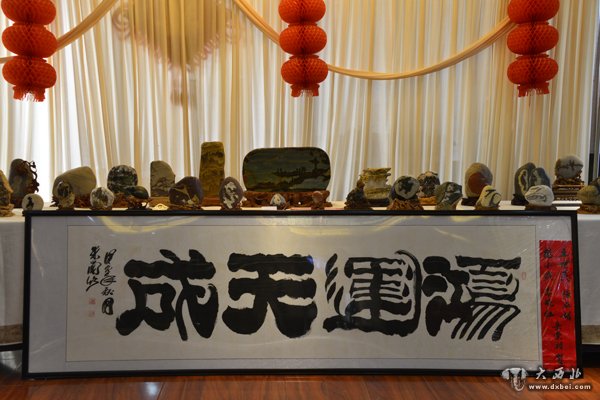 甘肃省观赏石协会2015年工作会议上展出的观赏石和来宾赠送的字画。 贾笑云 摄