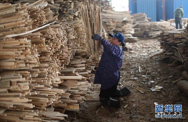 1月25日,胡凤莲把木材捆好后堆放在一起。新华社发(刘教清 摄)