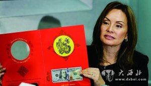美国财政部官员罗茜·里奥斯展示农历羊年限量版100美元“吉利钱”。