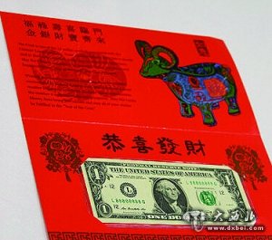 美国财政部造币和印钞局近期发行了羊年限量版“吉利钱”。“吉利钱”分100美元和1美元两种,纸币本身与普通美元无异,只是包装不同。100美元装在竖版大红卡片中,卡片上印有龙凤呈祥图案,还写着“福禄寿喜”、“龙凤呈祥”8个大字。1美元装在横版大红卡片中,卡片上写着“福禄寿喜临门,金银财宝齐来”、“恭喜发财”等字样。
