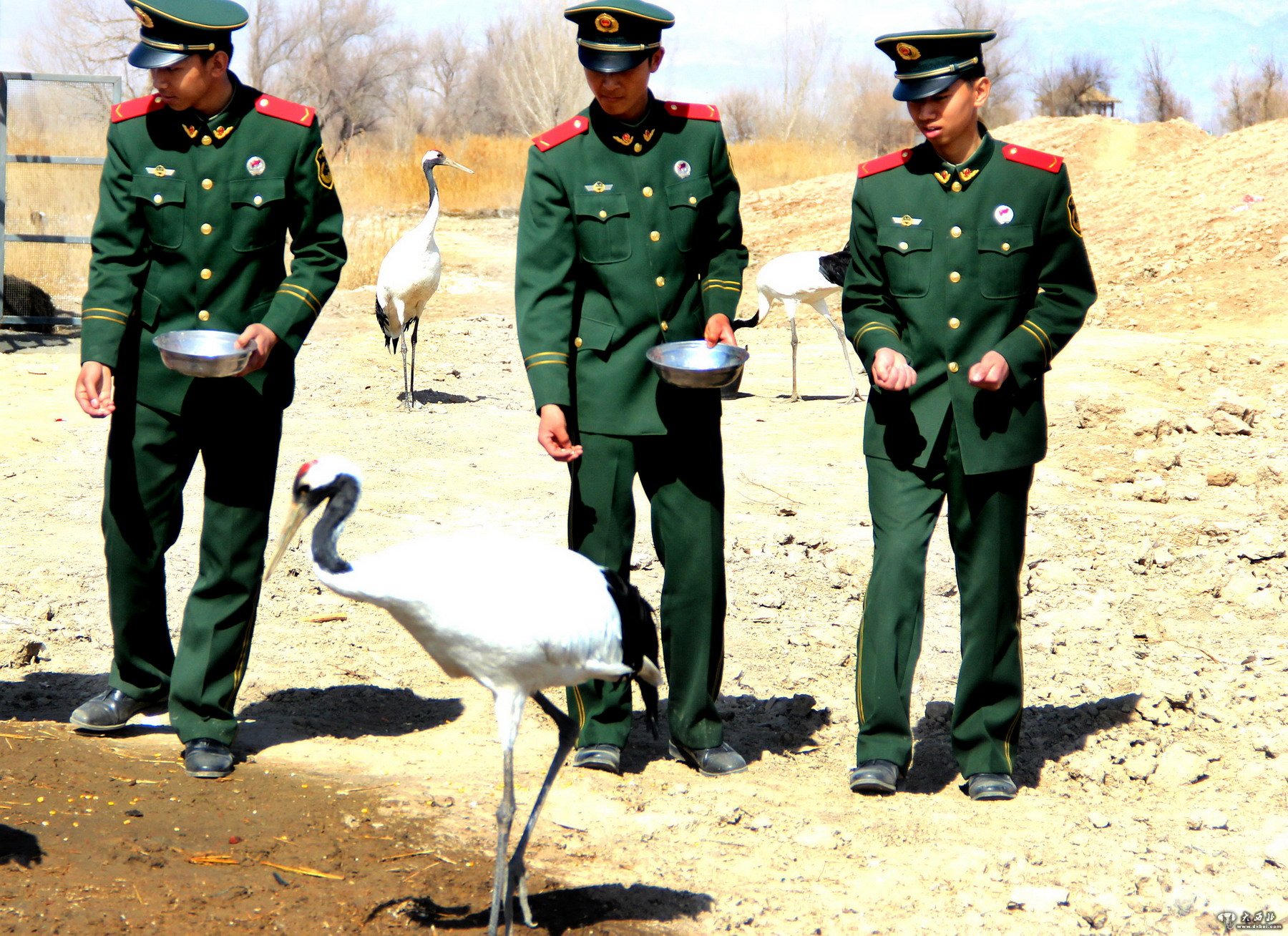 武警张掖森林支队三名战士在为丹顶鹤投放食物。