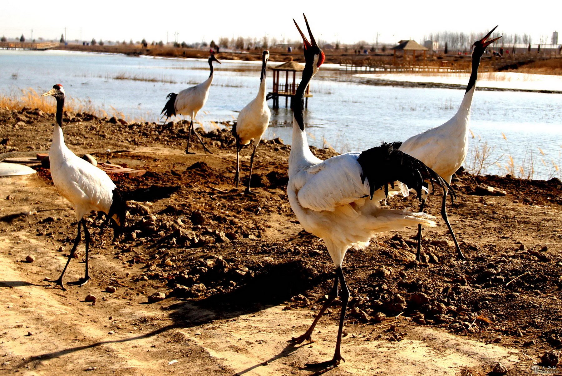 一群丹顶鹤在张掖湿地公园内自由嬉戏。