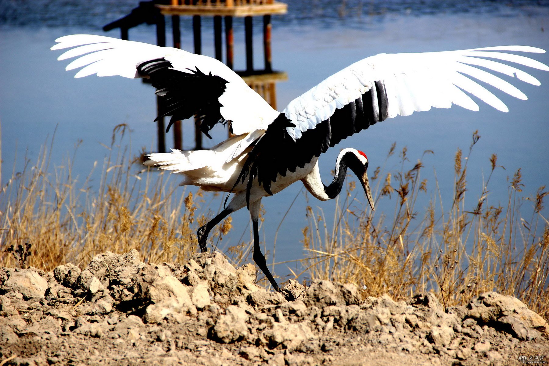 一只丹顶鹤在张掖湿地公园内自由嬉戏。