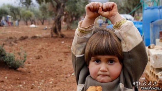 该照片是摄影师奥斯曼·萨厄尔于2014年12月在叙利亚阿特梅赫的一个难民营中拍摄的。小女孩以为摄影师手中的相机是武器,便举起了双手。(图片来源:BBC)