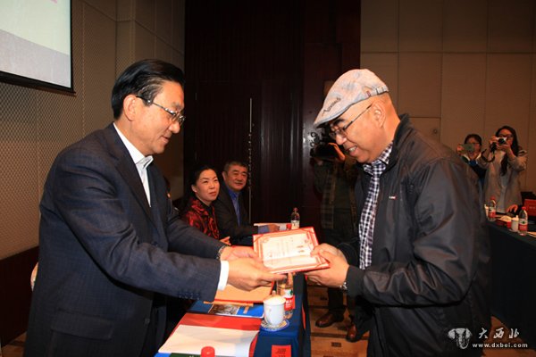 兰州市旅游局局长陶明贵为一等奖获得者、金色大漠旅行社总经理赵峰颁奖。 贾笑云 摄