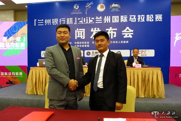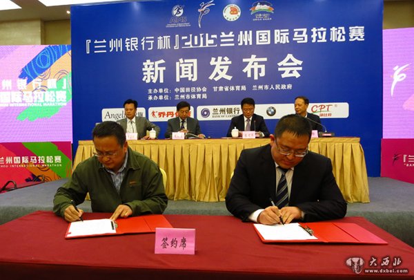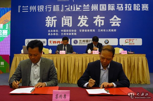 2015兰州国际马拉松赛新闻发布会签约仪式。 贾笑云 摄