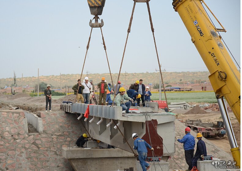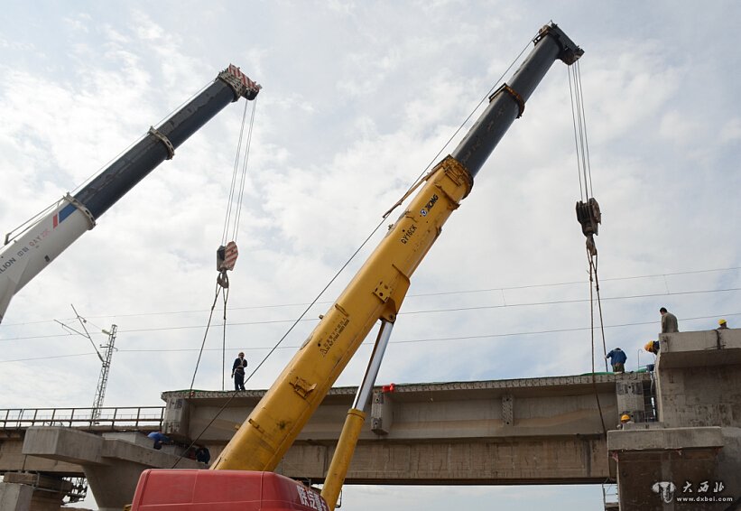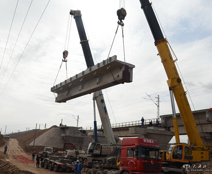 据介绍,大靖河中桥位于干武线冰草湾-谭家井区间K80+116.603处,该桥与营业线平行,线间距11.7m。起止里程桩号为K80+086.33~K80+148.075,桥梁全长61.745m,位于-2.2‰的坡道及直线上,孔跨布置为3-16m预应力混凝土T梁。由于冰草湾-谭家井区间接触网立柱位于线路左侧,对增建二线施工干扰小,是全线长钢轨卸车最早地段,也是全线最具备提前拉通段落。大靖河中桥3-16m简支T梁成功架设,对下一步轨道工程施工创造了有利条件。