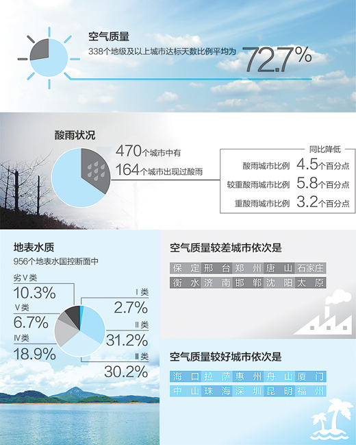 据环保部环境监测司司长罗毅介绍,2015年上半年,国家环境监测网继续开展环境空气、酸雨、地表水等各环境要素监测。按照《环境空气质量标准》,全国338个地级及以上城市达标天数比例平均为72.7%,其中轻度污染比例为18.7%,中度污染占5.2%,重度污染占2.7%,严重污染占0.7%。首要污染物为PM2.5。