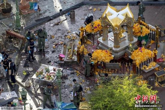 四面佛附近区域一片狼藉。泰国总理巴育称,这起在宗教圣地发生的炸弹爆炸事件是泰国遭受的“有史以来最严重袭击”。