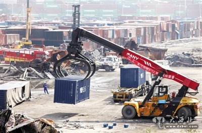 大西北网讯 9月8日,天津港集团施工人员正在清理“三号山”最后几个集装箱。目前,核心区集装箱已清理完毕。新华社发