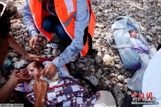 资料图:当地时间9月21日,一对叙利亚夫妇日前冒着生命危险,带着仅8个月大的双胞胎婴儿偷渡爱琴海,从土耳其抵达希腊。