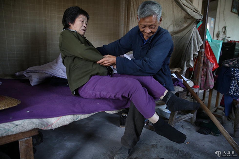 2015年10月18日消息,浙江省金华市。在浦江县前吴乡马桥村,72岁的独腿老人盛秉植悉心照料瘫痪妻子徐必球的故事,感动着许多人。55年前,17岁的盛秉植上山挖树根时不幸被200多斤的树桩压断了右腿。从此盛秉植不仅上不了学,还成了独腿的残疾人。图为妻子徐必球只能在盛秉植的帮助下起床。
