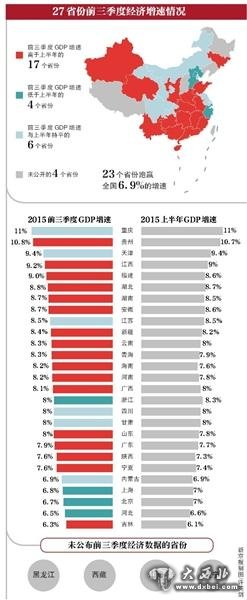 近一周以来,全国各省(区、市)陆续发布2015年前三季度经济运行数据。据记者统计,目前已有27个省份公布,山西、辽宁、黑龙江、西藏4省(区、市)尚未公布。