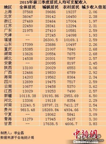 2015年前三季度城乡居民收入。
