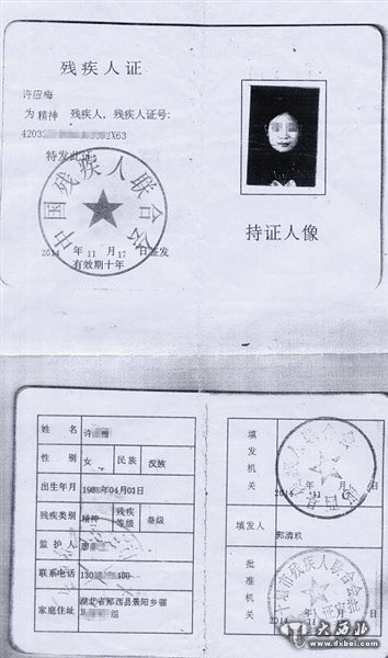 小梅的残疾人证及郧西县法院外景。此前,小梅在郧西县法院起诉离婚获调解,家人认为小梅患有精神病无民事行为能力,法院不应受理,要求恢复两人婚姻关系。小梅家人供图