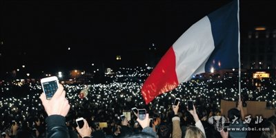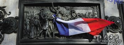 15日,在法国巴黎的共和国广场,人们将法国国旗挂在纪念碑上,悼念恐怖袭击遇难者。(记者 周磊 摄)