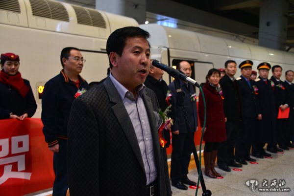 紫轩酒业党委书记唐钢在紫轩号高铁动车首发式上致词。 贾笑云 摄