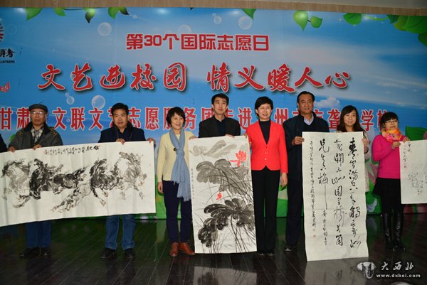 甘肃省文艺志愿者参观了校园,与师生们进行了爱心教育教学交流、举行了联谊演出和爱心捐赠活动。甘肃省文联领导与省书画研究院副院长张正功代表书画文艺志愿者将现场创作的20多幅书画作品赠送给兰州市聋哑学校。兰州市剪纸艺术传承人叶长友先生将现场创作的《爱》等剪纸艺术品赠送给学校,盲人歌唱家杨海涛演唱了《呼伦贝尔大草原》歌曲。