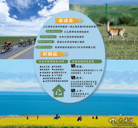 最新卫星遥感监测资料显示,三江源生态保护和建设一期工程实施后的9年中,成效彰显,三江源草地面积净增加123.70平方公里,水体与湿地面积净增加279.85平方公里,荒漠生态系统面积净减少492.61平方公里。而青海湖面积已经恢复到4389.31平方公里,达到了15年来同期的最大值。