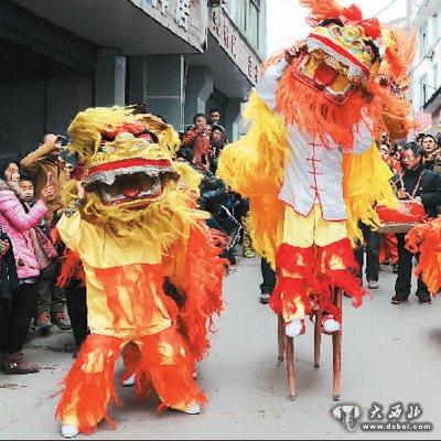 2月21日,四川省南充市嘉陵区三会镇街道上锣鼓齐鸣,当地民间艺人聚集此地进行高跷舞狮、川北灯戏、川剧变脸、车幺妹等民俗表演,吸引众多观众到街头观看。