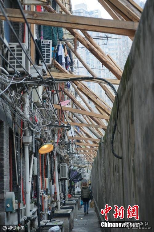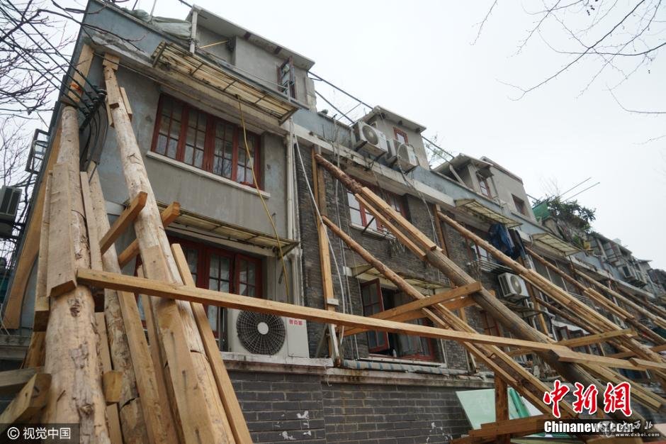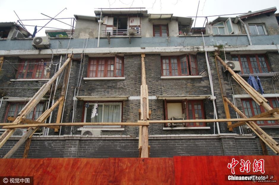 大西北网讯 3月13日,上海黄浦区,黄陂南路永年路一石库门旧里房屋发生倾斜开裂,外墙用数十根木棒进行加固,场面十分壮观,不少路人走过时都加快了脚步。据了解,此处房屋开裂倾斜是由于相隔一条马路的两个建筑工地野蛮施工造成。此段居民小区为上世纪20年代建成的砖木结构石库门建筑,房龄至今已经90余年,受影响的居民就多达几十户。 图片来源:视觉中国