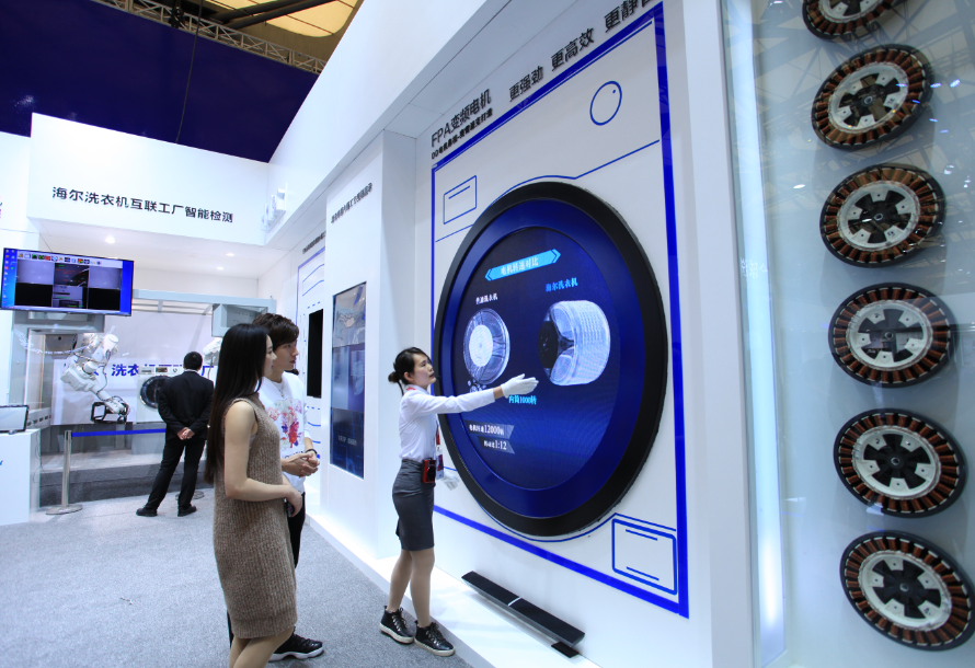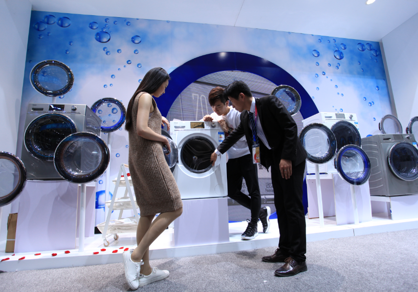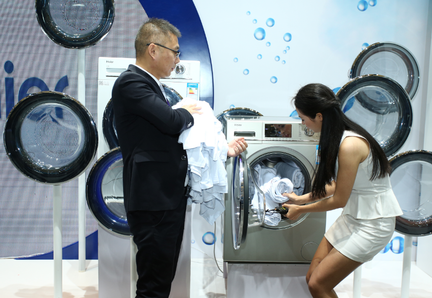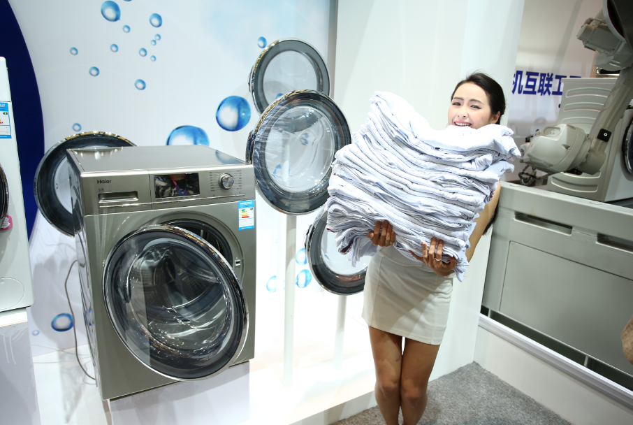 大西北网讯 一台8公斤体积的滚筒洗衣机,一次能装多少件T恤?海尔紫水晶2016AWE现场挑战大容量!直径525mm的紫水晶,一共掏出100件T恤!