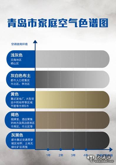 举例来说,在崂山区等沿海湿度大的家庭,因为空气环境较好,而且由于潮湿经常关闭门窗,所以空调的灰尘普遍呈现浅灰色;在市北区、李沧区等都市人口密集区的家庭取样中,空调灰尘呈灰白色布土,原因是家中棉被扬起的棉絮被空调吸入让过滤网和换热器上的灰色灰又增加了白色棉絮附着;在靠近发电厂、大型货运中转地带等区域、平度等市郊五市的家庭,空调灰尘呈黄色;在市南、市北等棋牌室、酒店聚集的地方或紧挨这些区域的居民区,家中空调灰尘则呈褐色。并且,海尔服务人员在清洗过程中也发现,每个区域居民家中的空调使用时间越长灰尘颜色会越深。