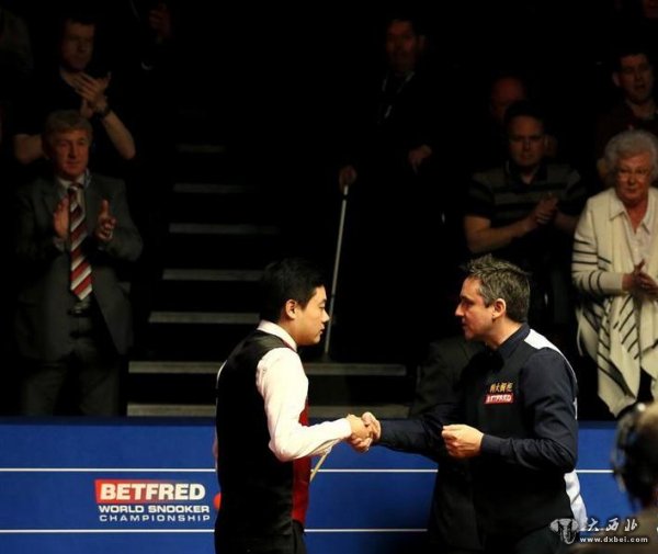 4月30日,丁俊晖(左)在晋级决赛后与对手麦克马努斯握手。