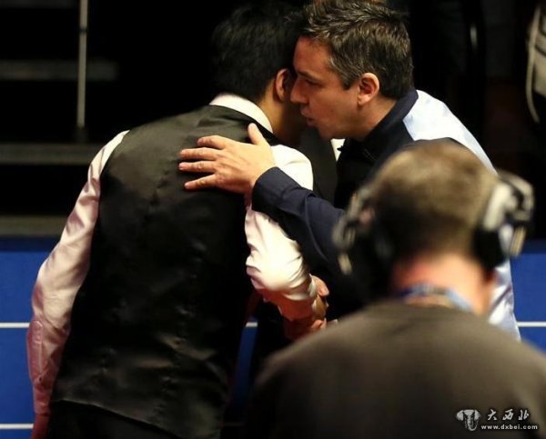 4月30日,丁俊晖在比赛后与对手麦克马努斯拥抱。