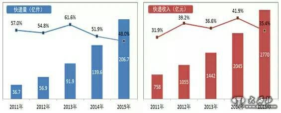 大西北网讯 昨天国家邮政局发布了2015年邮政行业发展统计公报,数据显示2015年全年业务总量突破5000亿元,业务收入突破4000亿元,快递业务量突破200亿件。全年邮政行业业务总量完成5078.7亿元,同比增长37.4%。全年邮政行业业务收入(不包括邮政储蓄银行直接营业收入)完成4039.3亿元,同比增长26.1%。邮政普遍服务业务中的函件,包裹,报刊和汇兑业务都有所下降。而快递业务快速增长。全年快递业务量完成206.7亿件,同比增长48%;快递业务收入完成2769.6亿元,同比增长35.4%。快递业务量排名前五位的省份依次是广东、浙江、江苏、上海和北京,其快递业务量合计占全部快递业务量的比重达到69%。