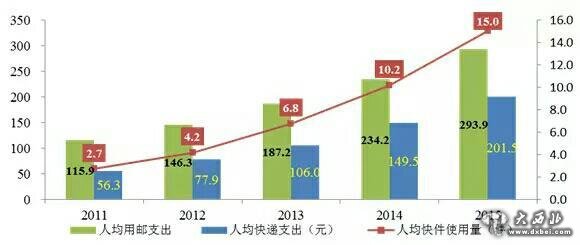 2011-2015年人均用邮支出、快递使用量和快递支出情况