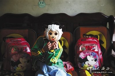 莎莎戴着喜羊羊面具,她很喜欢看动画片。