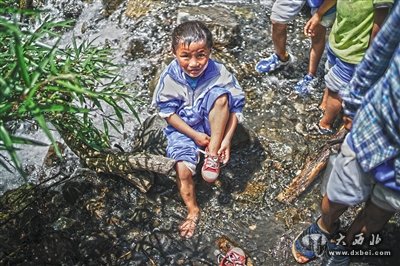 大约行走了4个小时,经过一个小溪时,6岁的吉克成业脱下鞋把脚泡在水里。