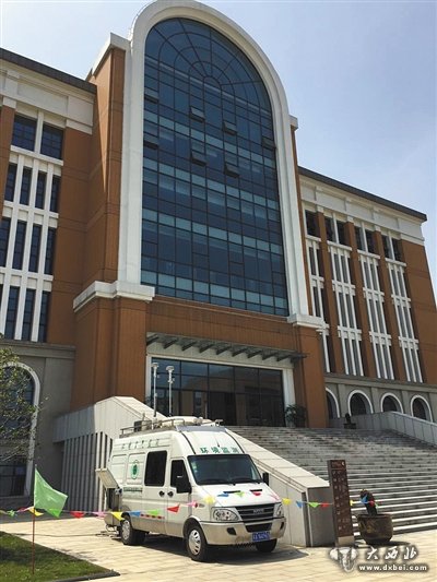常外事件后,环境监测车辆停在教学楼下监测空气。