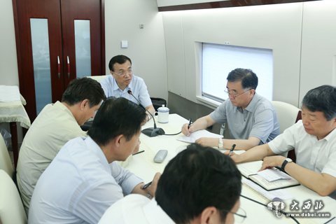 7月5日上午8时,李克强从北京启程飞赴安徽淮河汛区。飞行途中,总理与汪洋、杨晶同志及水利、气象部门负责人根据最新汛情研究防汛工作。