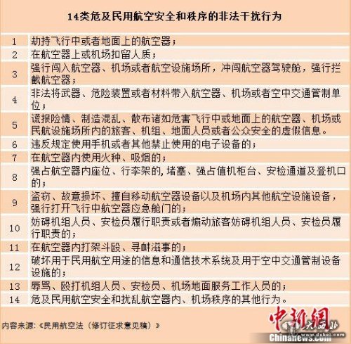 《修订稿》详细列举14类危及民用航空安全和秩序的非法干扰行为。