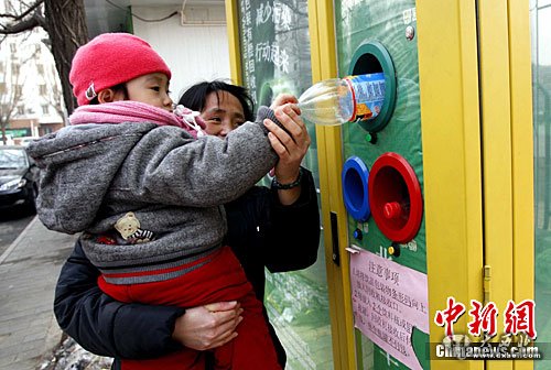北京某社区居民将空饮料瓶投入饮品包装自动回收机,并收到相应的硬币。该回收机不仅方便居民处理垃圾,还提醒人们参与环保。中新社记者 张宇 摄