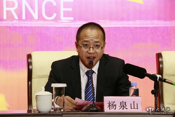 贾泰斌在会上致辞,对敦煌大剧院正式投入运营表示祝贺,同时希望地企双方携手并肩,精诚合作,共同培育会展演艺产业,打造一流产品,用最短时间,让文博会的效应、场馆的效应得到最大程度的发挥。
