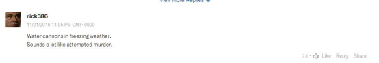网友Sweeneybird表示,视频中的高压水炮是直接对准人群而非火苗。非暴力抗议是公民的权利,警方的做法十分可耻。