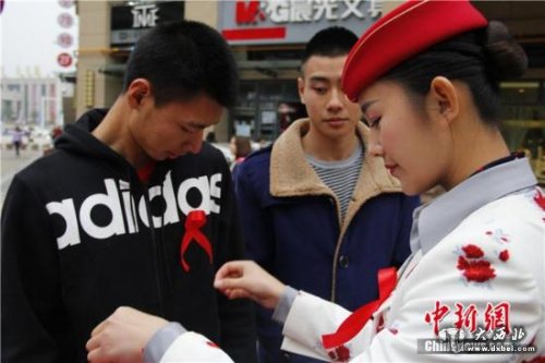 资料图:四川西南航空职业学院的10名准空姐、准空少以“艾滋病患者”的身份,向过往的行人索要拥抱,以此进行“防艾”宣传。毛成山 摄