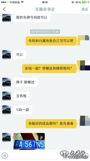 “135块一副,包含牌子和安装螺丝扣,车牌号码你提供,小车蓝牌,大车黄牌都有。”一卖家告诉记者。记者提出要看一下成品实拍图时,对方通过旺旺发来一个“渝A”车牌照片,车牌上多处有与真照一样的防伪底纹。对方承诺,“保证和真的一样,交警都看不出来”。