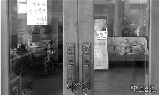 更多的场所不仅停业,还关门了。记者在“大富豪足道会馆”看到“消防整改,暂停营业”这样的纸条贴在门口。这家店原本也只提供足浴服务,后来经过装修,增加了汗蒸等项目。离这个足道馆几十米外,还有一家“西子人间会所”,同样大门紧闭。