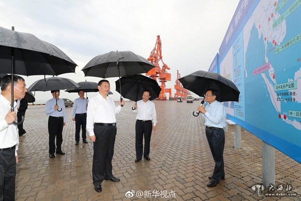 习近平总书记19日下午冒雨考察坐落于广西北部湾的北海市铁山港公用码头。天高水阔,吊车高耸入云。他听取码头规划和建设情况,了解广西北部湾经济区发展建设和面向东盟开放合作情况。习近平表示,铁山港有区位优势,发展前景广阔,将来是北部湾经济区一个重要依托。要建设好北部湾港口,打造好向海经济。我们常说要想富先修路,在沿海地区要想富也要先建港。